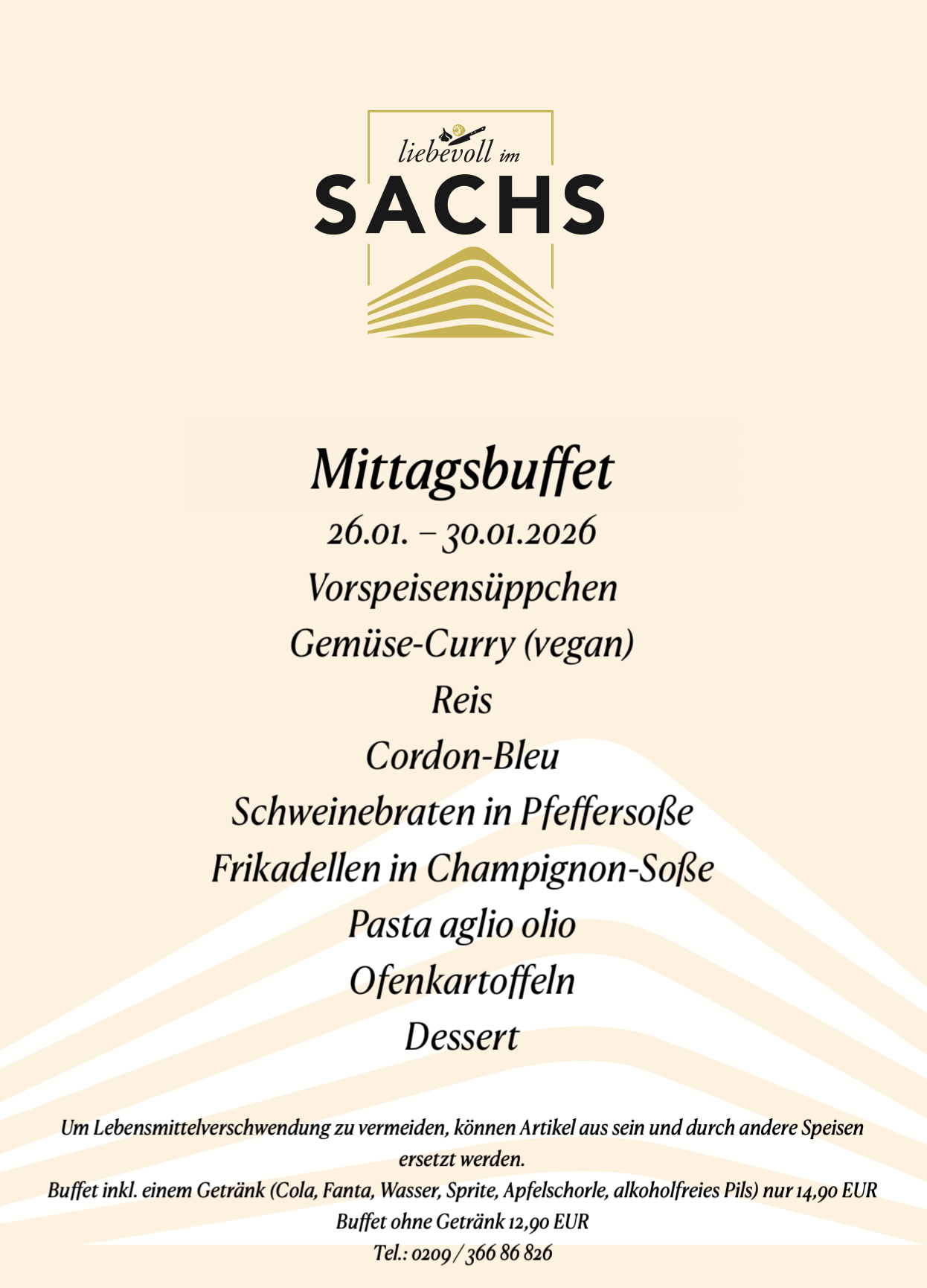 An dieser Stelle präsentieren wir Ihnen unser abwechslungsreiches Mittagsbuffet im "liebevoll im Sachs", das jede Woche mit neuen und sorgfältig ausgewählten Speisen aufwartet. Es ist darauf ausgelegt, Ihnen kulinarische Vielfalt verbunden mit frischen Zutaten und liebevoller Zubereitung zu bieten.